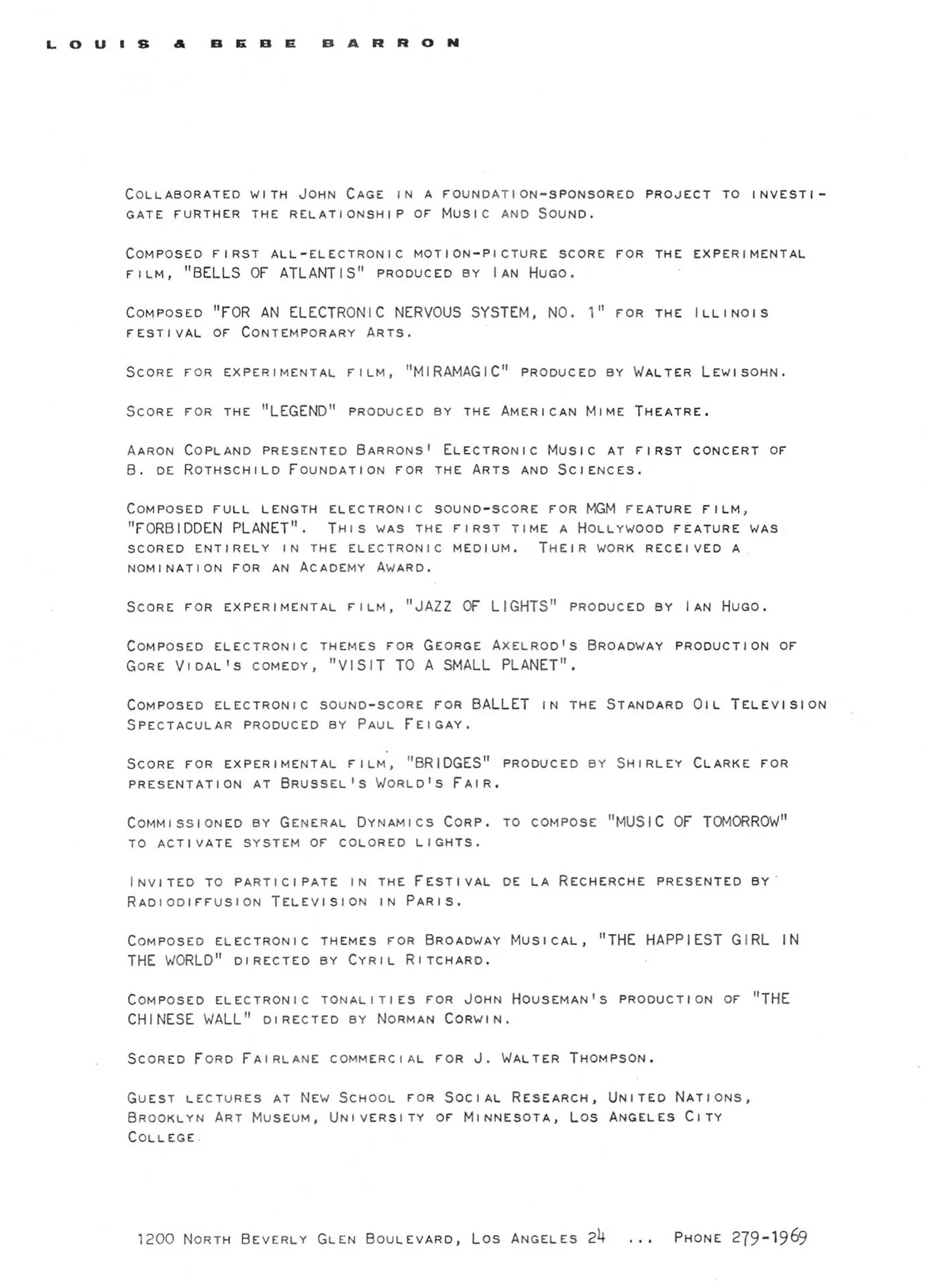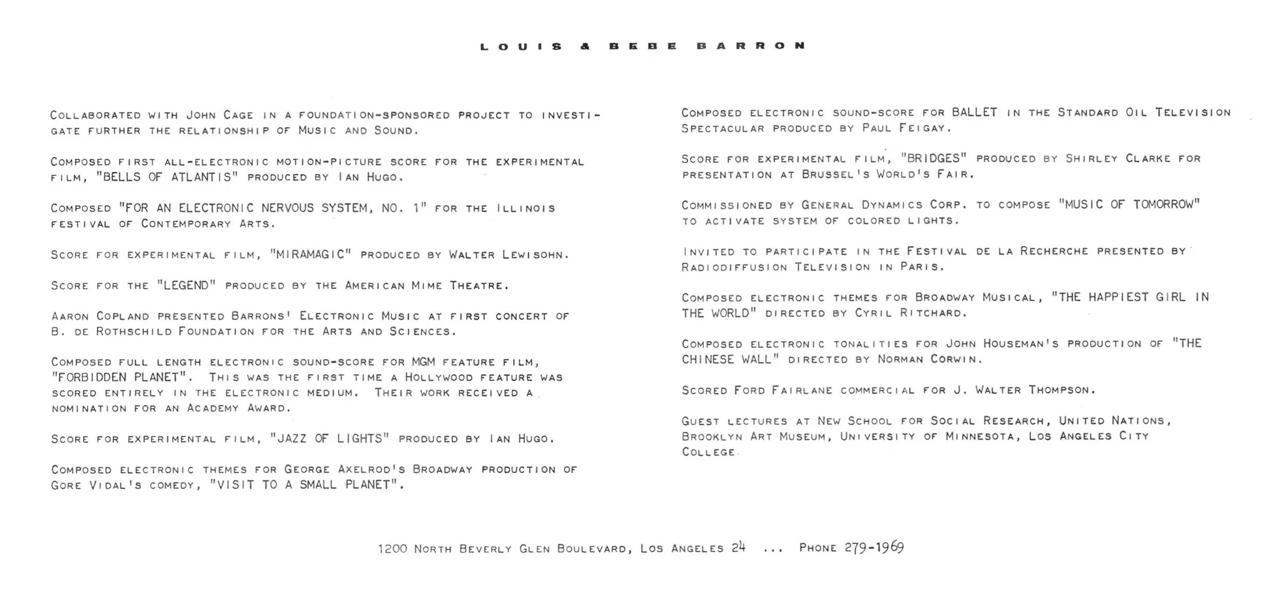 Louis and Bebe Barron are most known for composing the first entirely electronic film score for a major motion picture, MGM’s Forbidden Planet in 1956. So far ahead of the curve were they that the release of Forbidden Planet generated a fair amount of controversy during which the team decided to use an unusual credit for their work. As quoted from the journal Cinefatastique (1979):